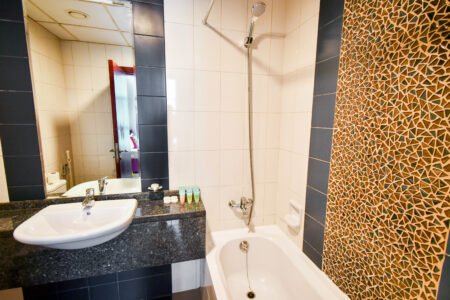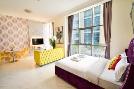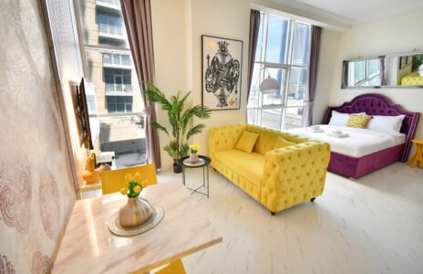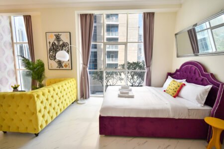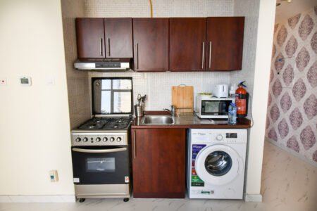 ozy Studio apartment in the center of Dubai, you’ll find this property equipped for the most discerning guests. A fully stocked, gourmet kitchen awaits with features including cooking ware, fitted fridge, freezer, stove and oven.
