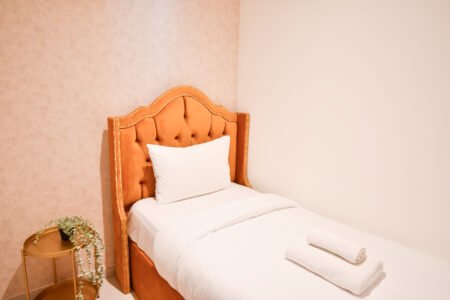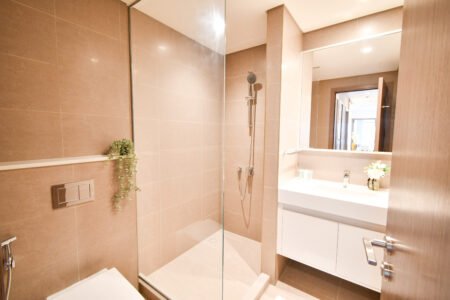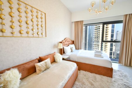 The master bedroom is a luxurious high-floor haven, with One queen-sized beds, premium linens, and stunning views of the Burj Khalifa and the dancing fountains. The en-suite is lavishly designed with a deep soaking tub, rainfall shower, and marble finishes. The second and third bedrooms have 2 beds each (1 Queen & 1 single) also offer incredible high-floor views and plenty of closet space, while the small bedroom with a single bed is perfect for a nanny or child. Get ready to be mesmerized by the breathtaking high-floor views of Dubai’s skyline.