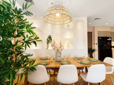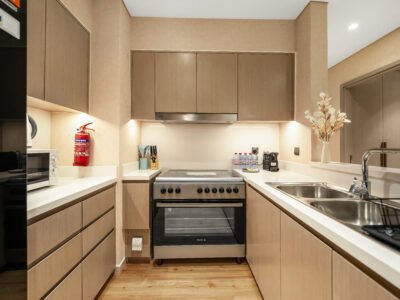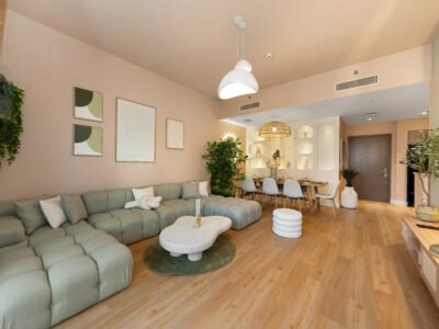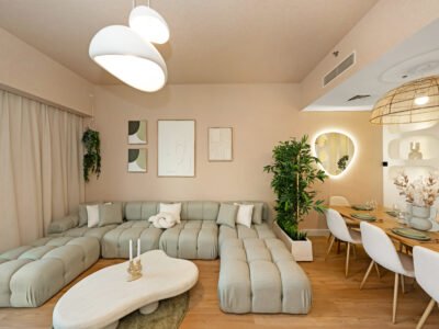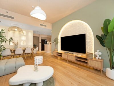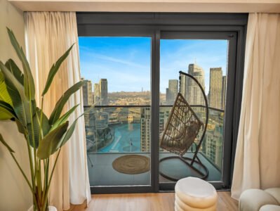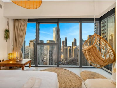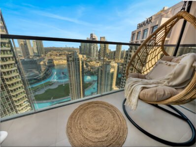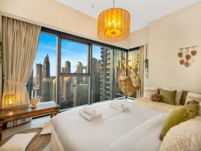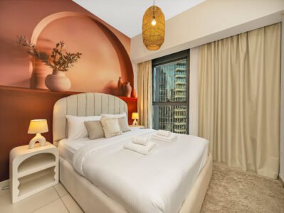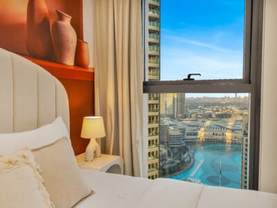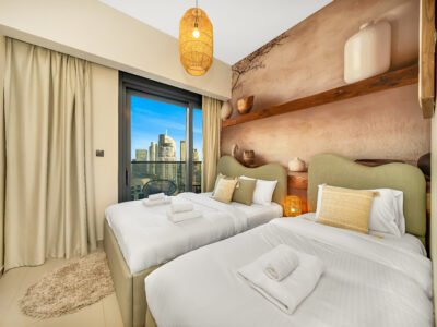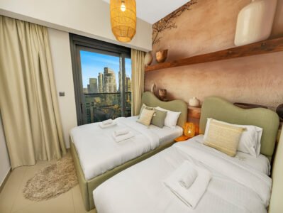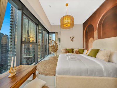 oar above Downtown Dubai in this stylish boho-chic 3-bedroom apartment + nanny room located on a very high floor of the brand-new Act One Tower with best amenities such as gym, health club, free parking and 24/7 security. The apartment comes with With Panoramic Dubai Fountain views, a fully equipped kitchen, and a dining space. This apartment is perfect for up to 10 guests. Situated steps from the Burj Khalifa, Dubai Mall, and Dubai Opera, it’s the ultimate urban getaway.